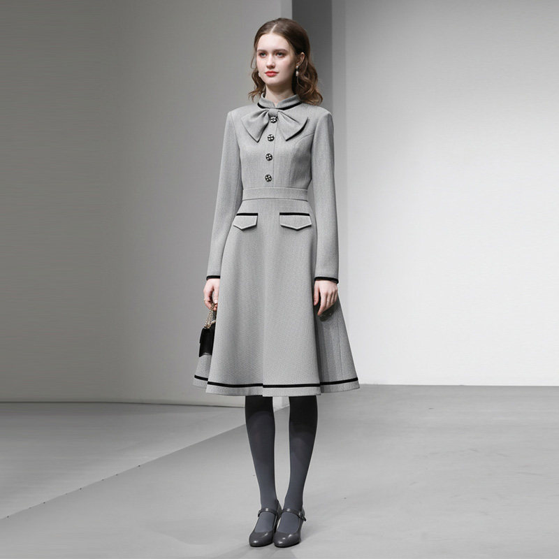 2025冬季新款时尚千金风蝴蝶结设计长袖收腰A字大摆中长连衣裙女