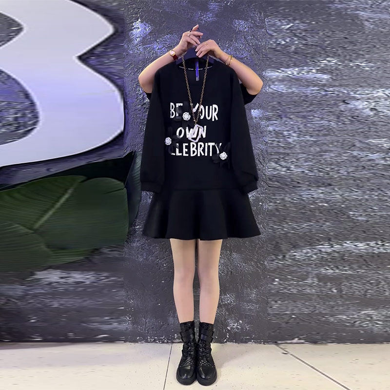 胖MM加肥圆领字母长袖拼裙摆连衣裙大码女装黑色显瘦中长款休闲裙