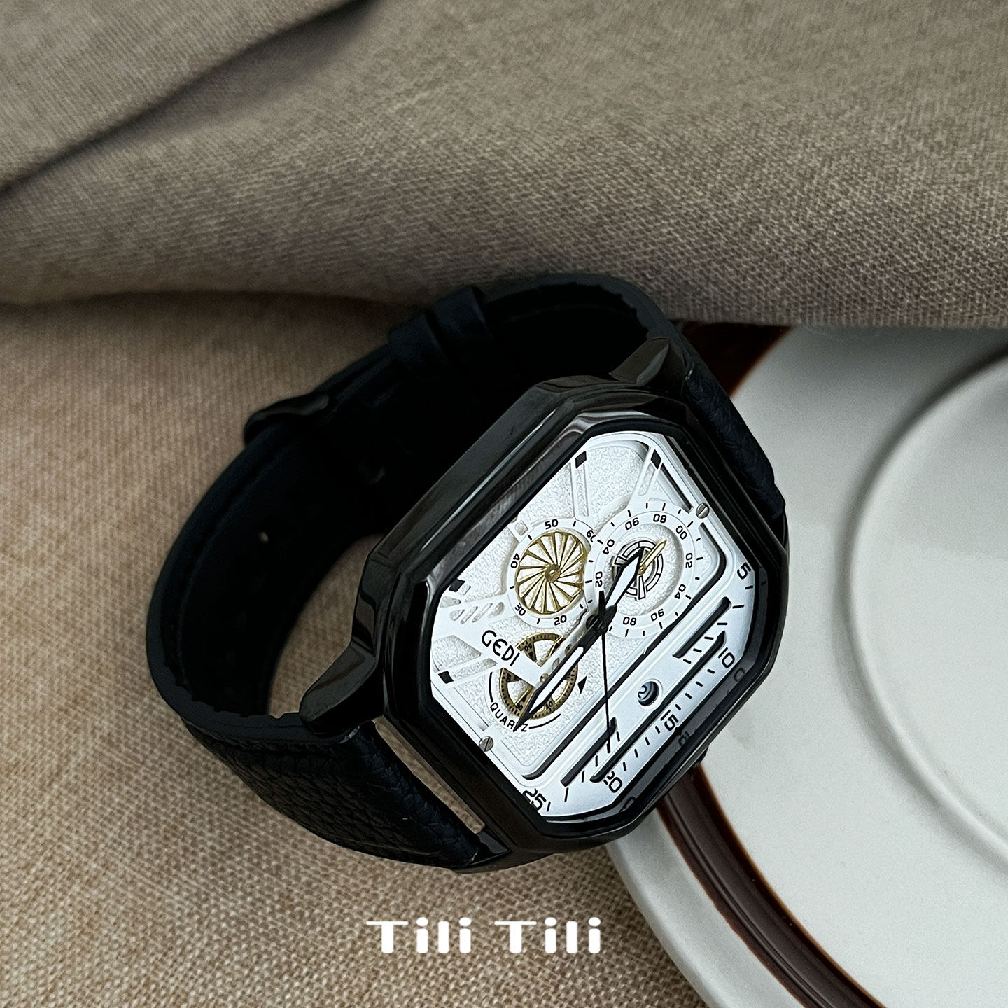 TILI时尚小众高级感方形镂空表盘皮带手表男士商务潮流腕表黑白色