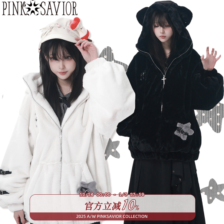 pinksavior【银河星】加厚环保皮草里绒冬季保暖连帽熊耳星星外套