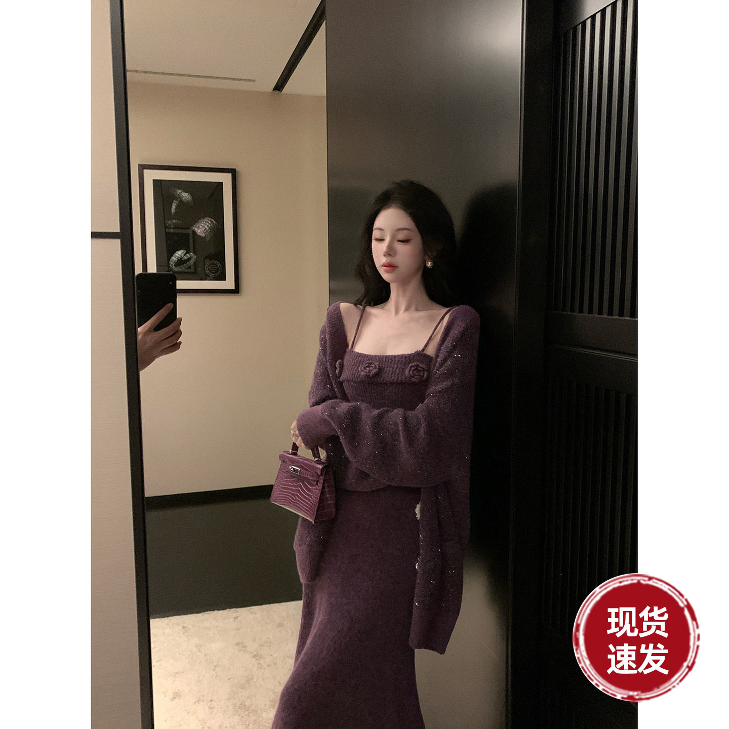 雅乔【星花怒放】秋冬慵懒羊驼毛毛衣外套亮丝羊毛针织吊带裙套装