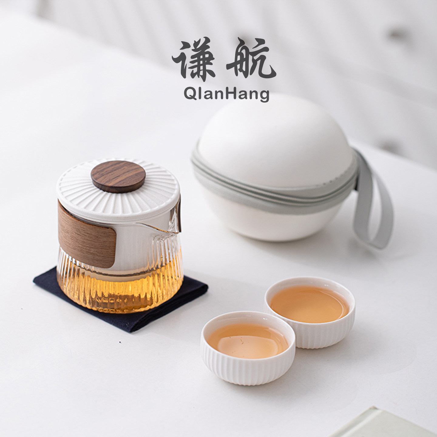 谦航便携式户外旅行茶具套装玻璃一壶两杯二人茶具个人专用快客杯