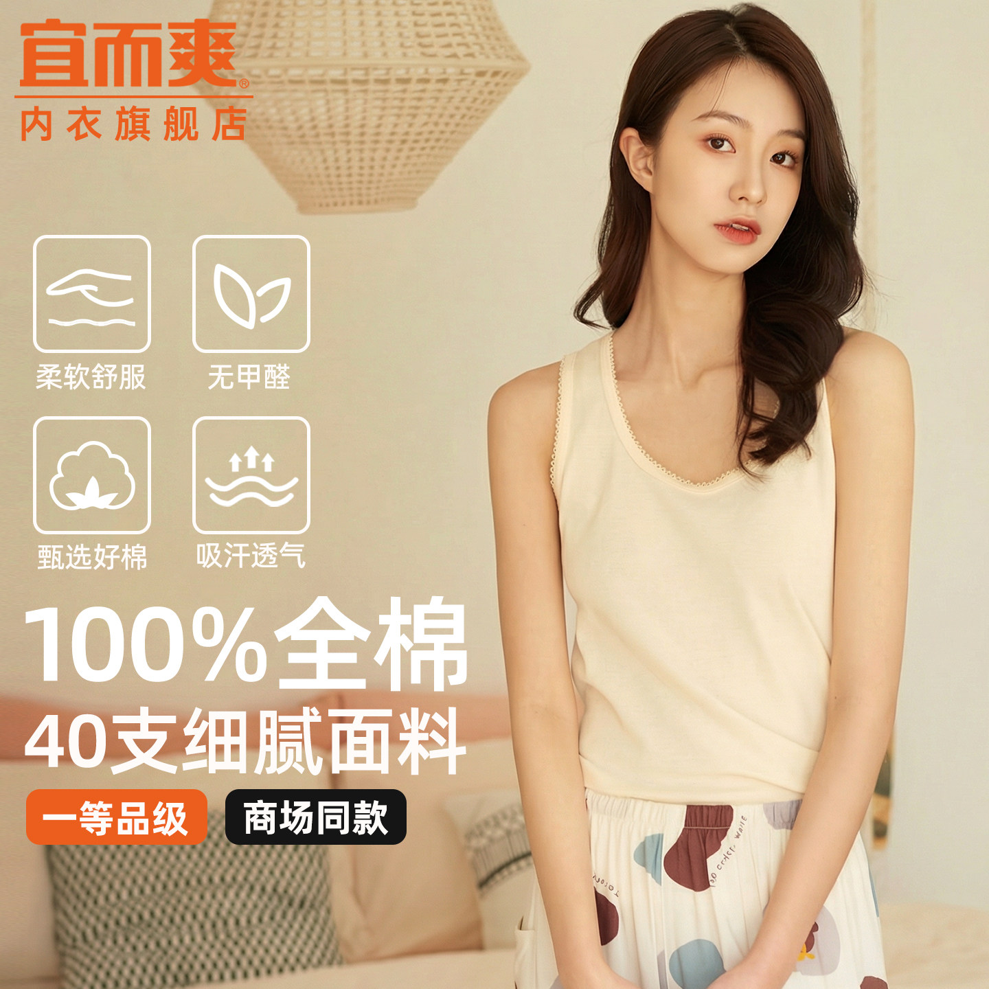宜而爽40支100%全棉背心女吊带衫新疆棉弹力透气轻薄吸汗内搭外穿