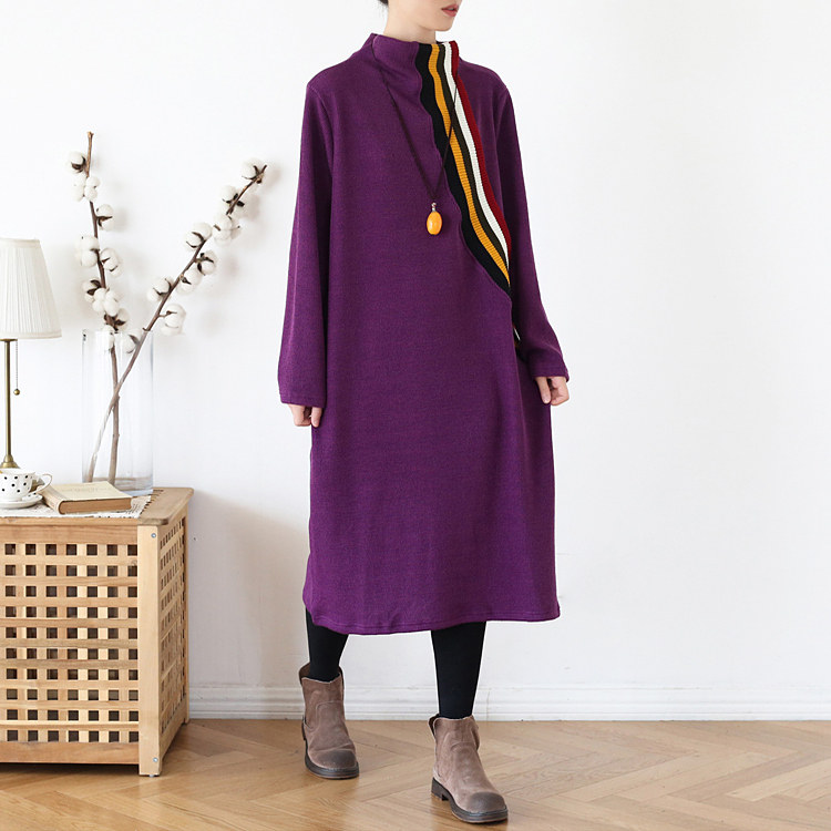 秋冬款毛衣裙过膝针织半高领撞色彩带拼接休闲时尚大码胖mm连衣裙