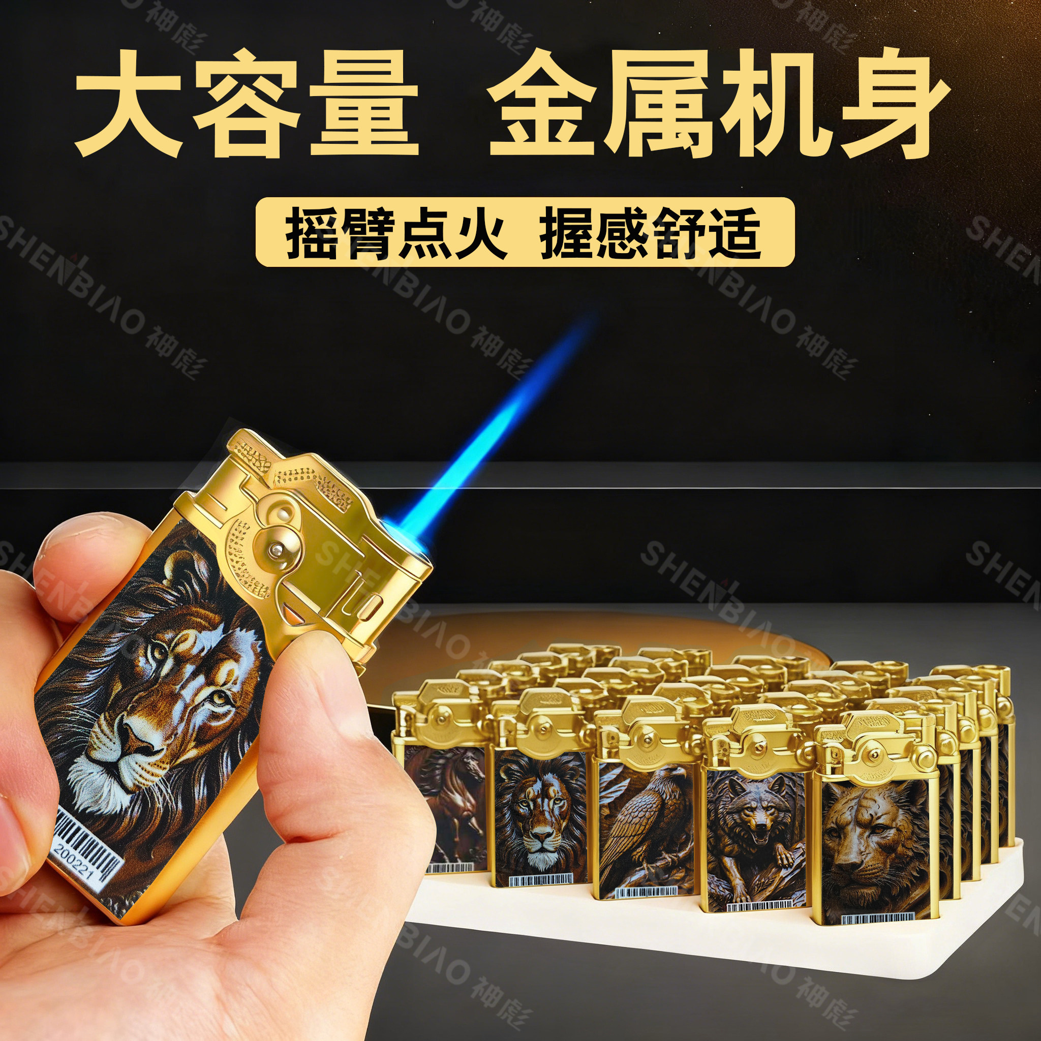 新款摇臂金属防风充气打火机金色狮子图案蓝焰耐用大容量火机定制
