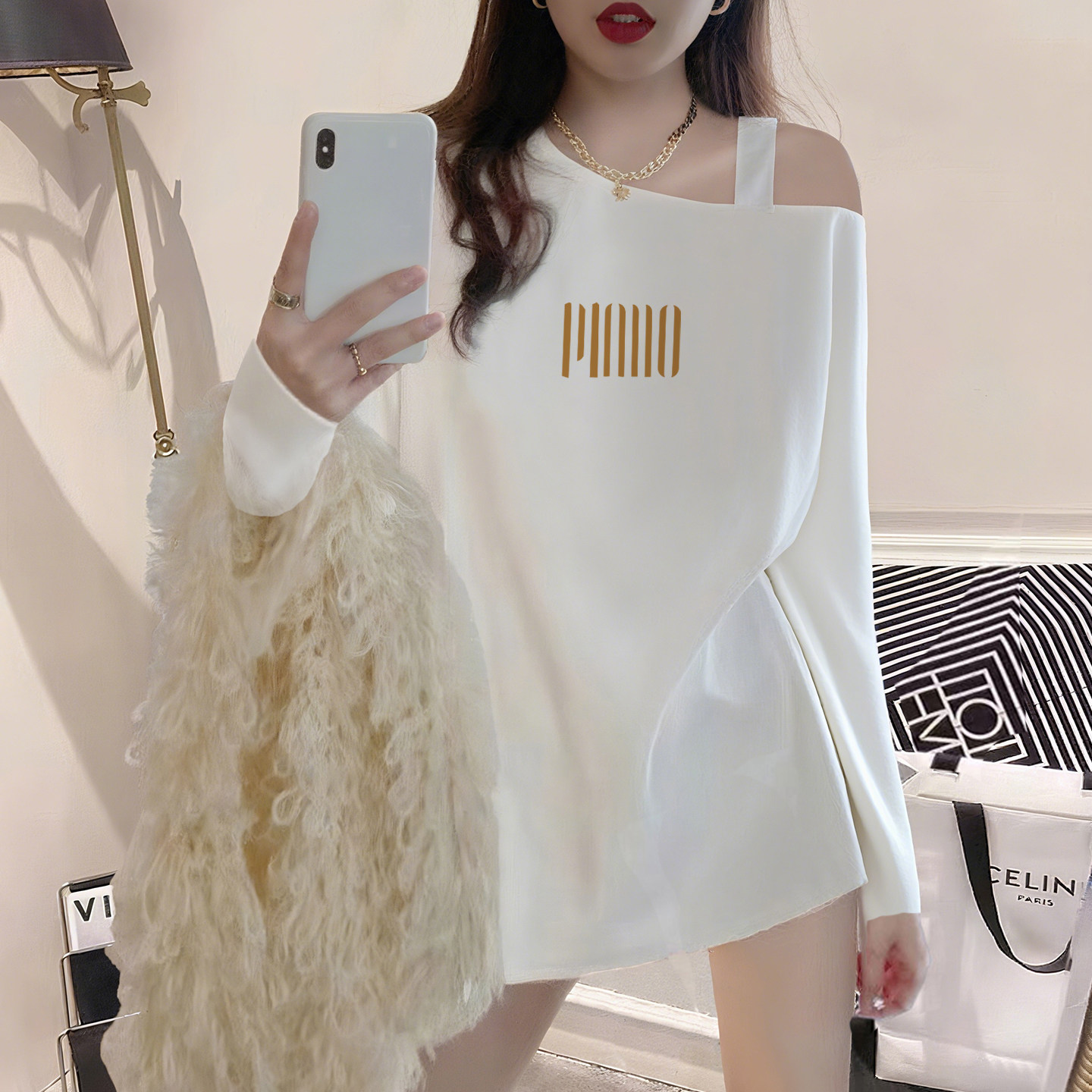 高级感斜肩白色长袖t恤女秋2025新款中长款遮屁股上衣露肩打底衫