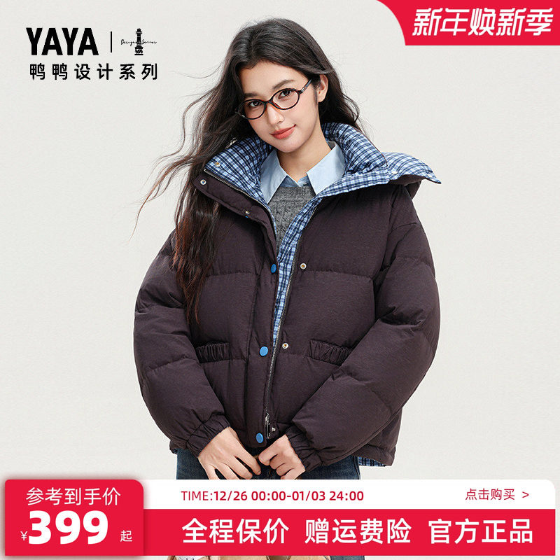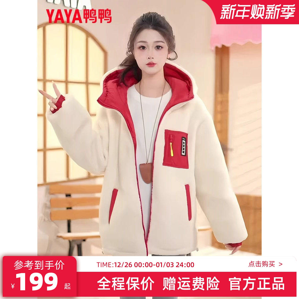 鸭鸭冬季新款羽绒服女短款连帽加厚保暖鸭绒时尚羊羔毛两面穿外套