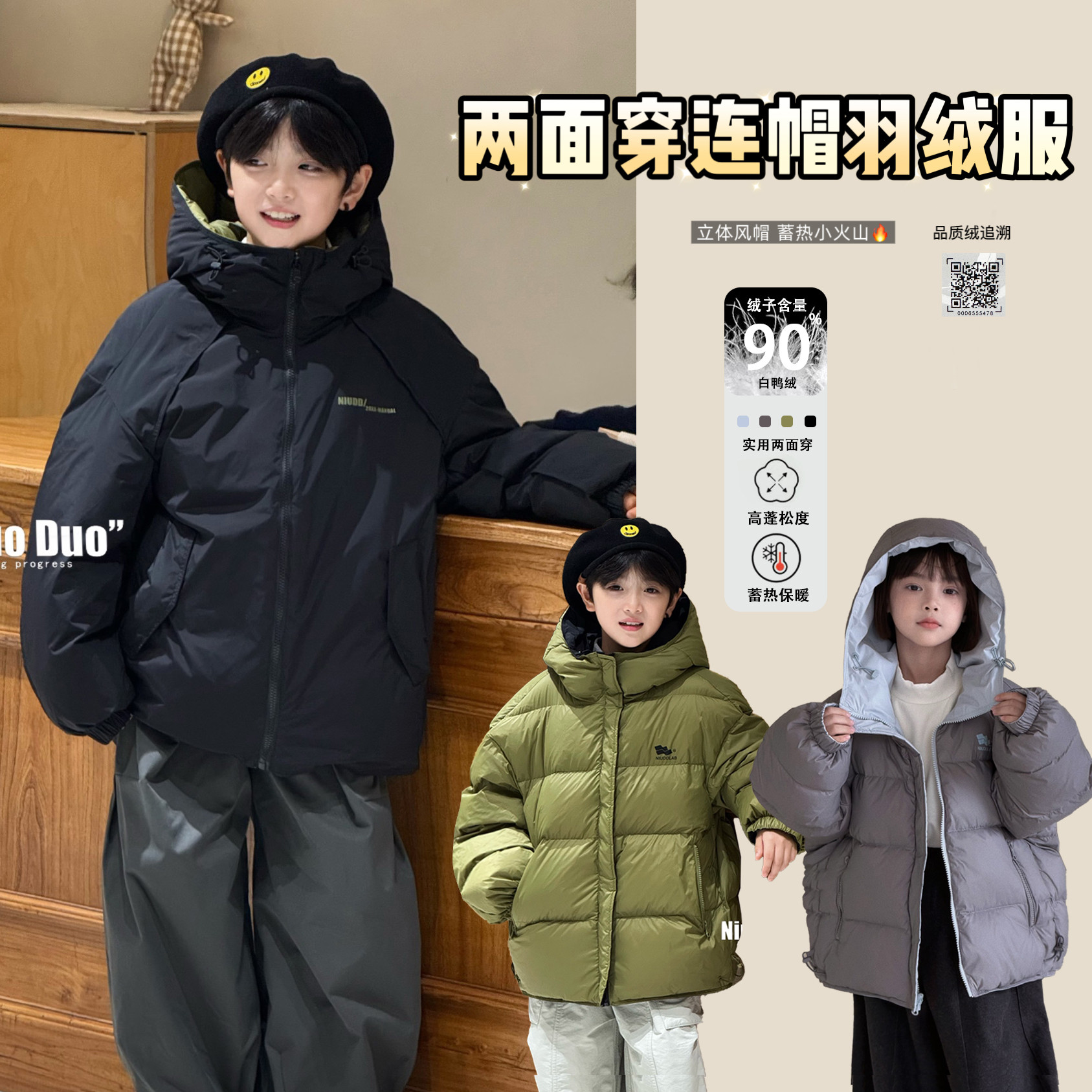 牛哆哆童装2025冬新款两面穿羽绒服男女童连帽90白鸭绒外套45015
