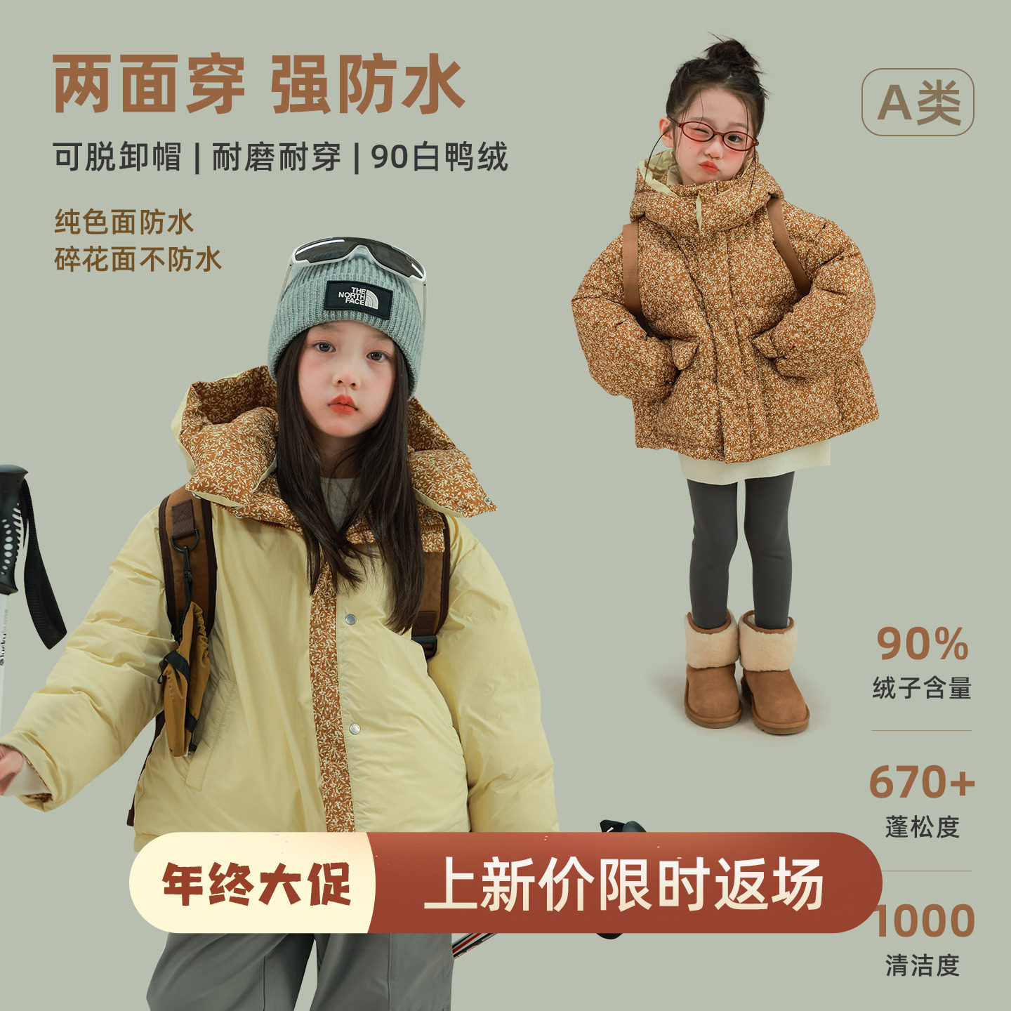 Ryleecru男女童连帽中长款两面穿鹅绒羽绒服防泼水冬款拜年服