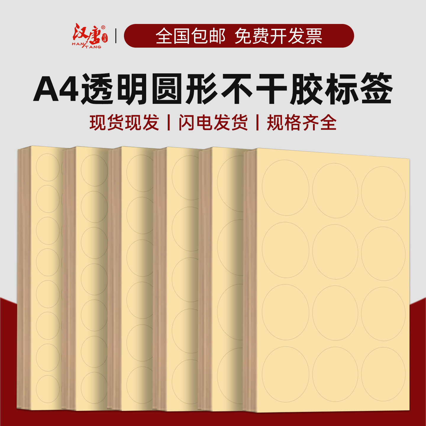 汉唐封口贴不干胶贴纸圆点标签a4圆形空白pvc打印纸口取纸塑料盒彩盒自粘标贴封盒标签贴纸透明圆形封口贴纸