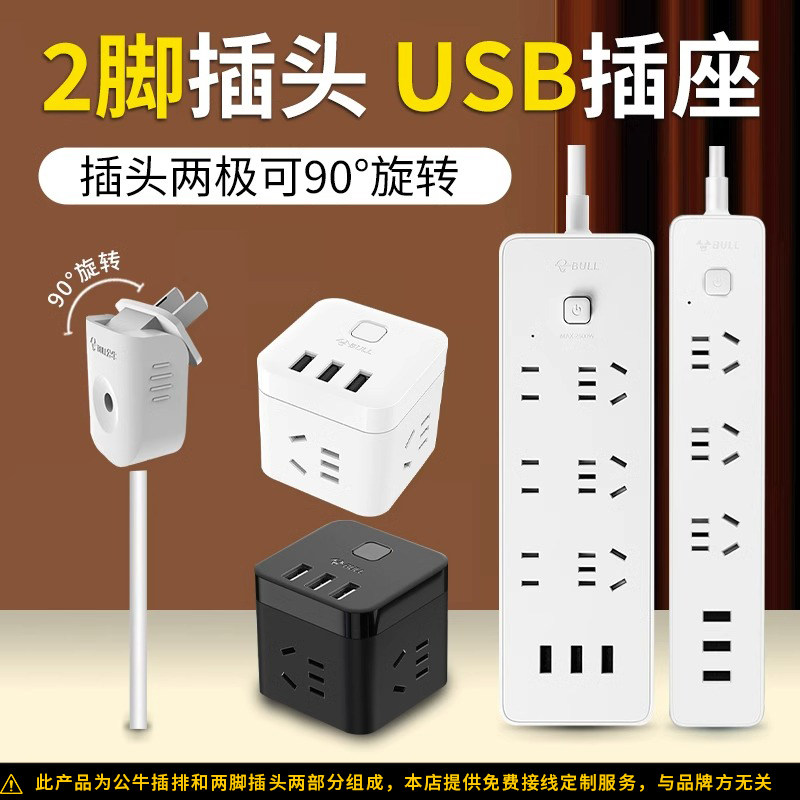公牛两脚插座两项插头接线板2脚两孔插线0.5米1米超短线USB插线板
