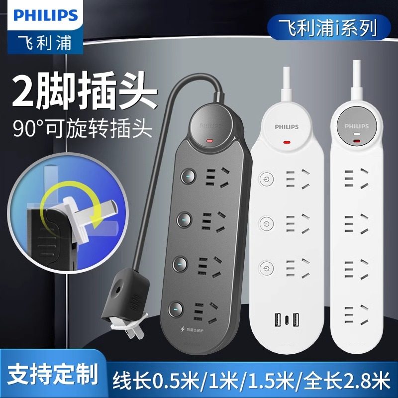 飞利浦两脚插排两项插头接线板2脚两孔0.5米1米超短线USB插线板