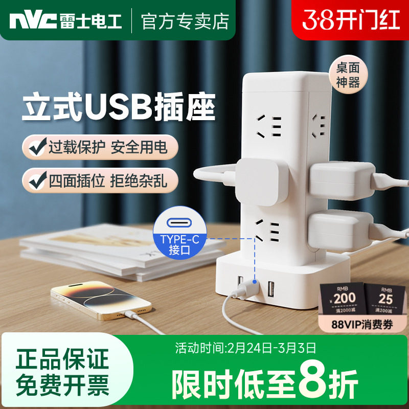 雷士电工立式插座插线板排插排宿舍家用桌面插座多插位USB插线板