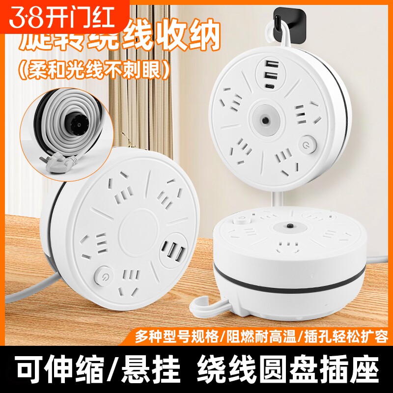 圆形可收纳插座多功能伸缩排插宿舍插线板USB插排家用插电板长线