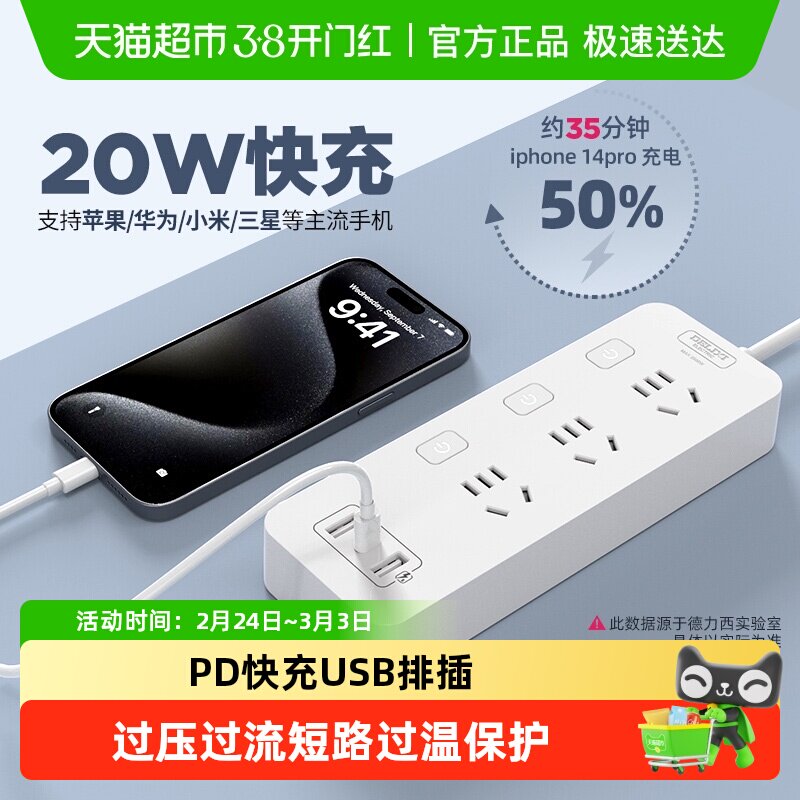 德力西插座USB插线板快充插排多孔智能苹果家用充电器接线板插板