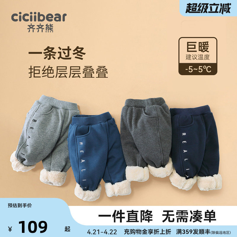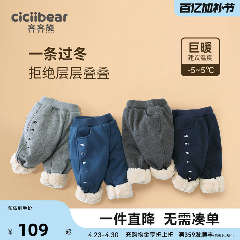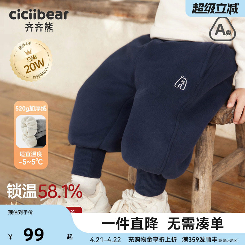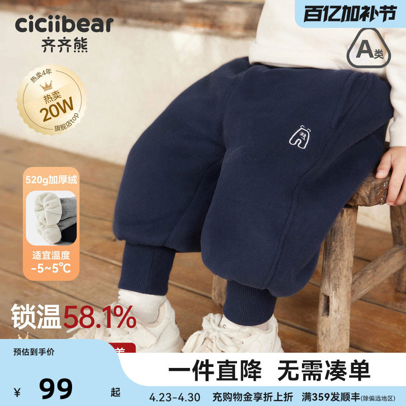 [防冻裤][520G一体绒]齐齐熊宝宝裤子加绒加厚棉裤冬季男童卫裤女