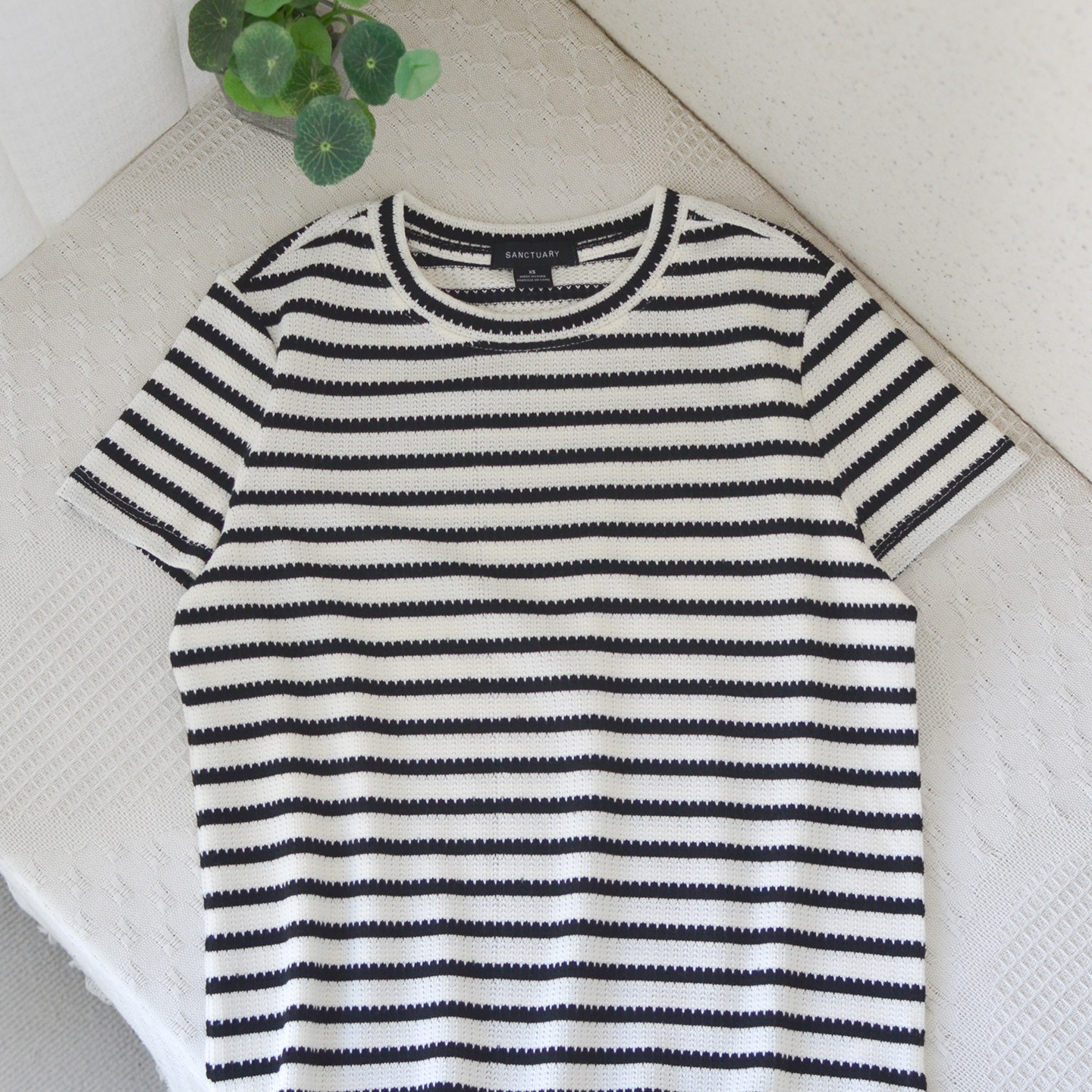 成人女装!!!美单纯元~XS-XXL简约条纹针织短袖T恤清凉麻感体恤