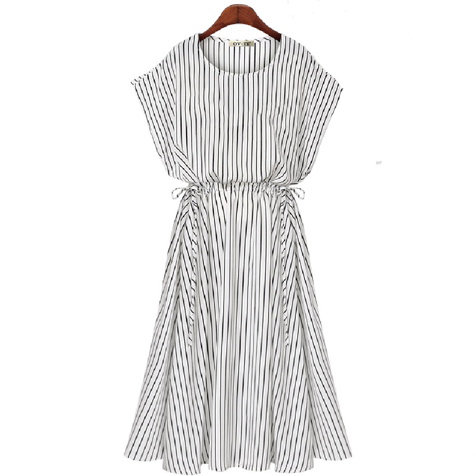大码女装欧美夏季新品圆领经典条纹宽松显瘦腰部抽绳无袖连衣裙女