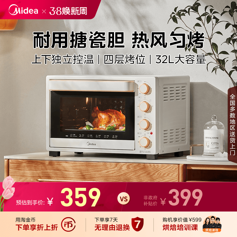 美的烤箱家用32L发酵干果机烘焙专用搪瓷空气炸锅风炉电烤箱324D