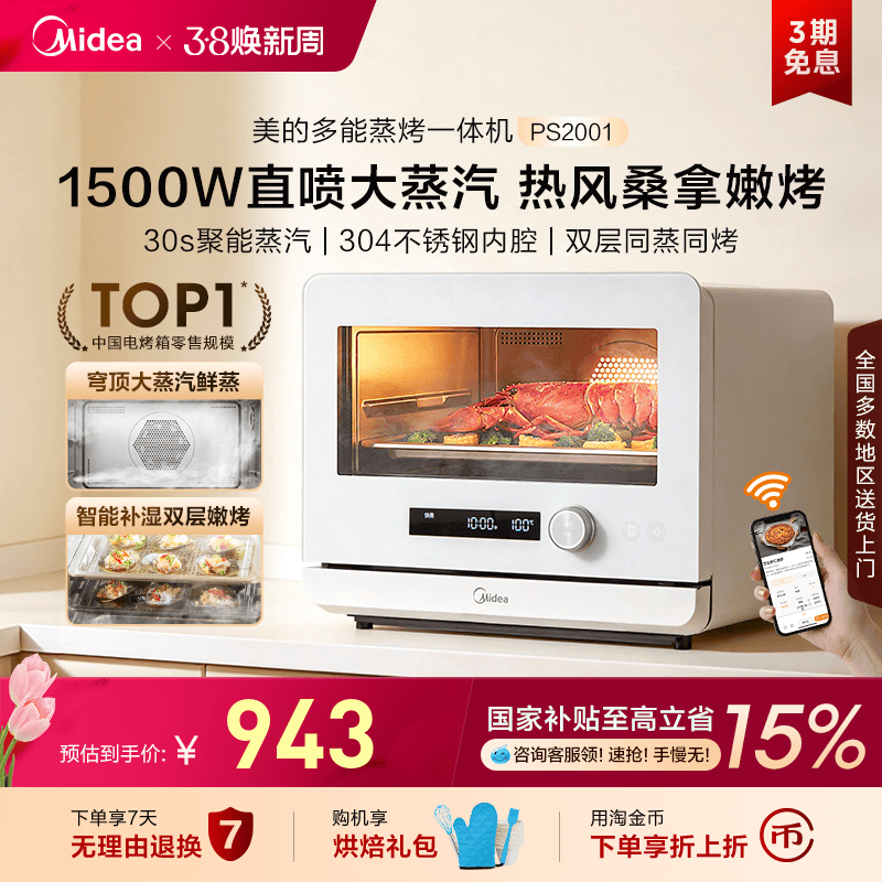 美的蒸烤一体机PS2001台式家用电烤箱电蒸箱空气炸锅多功能蒸烤箱