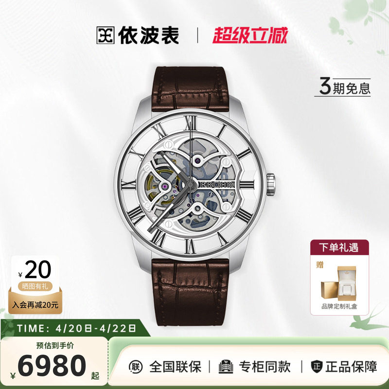 zEBOHR依波手表男真皮表带经典镂空休闲时尚防水自动机械男表5148