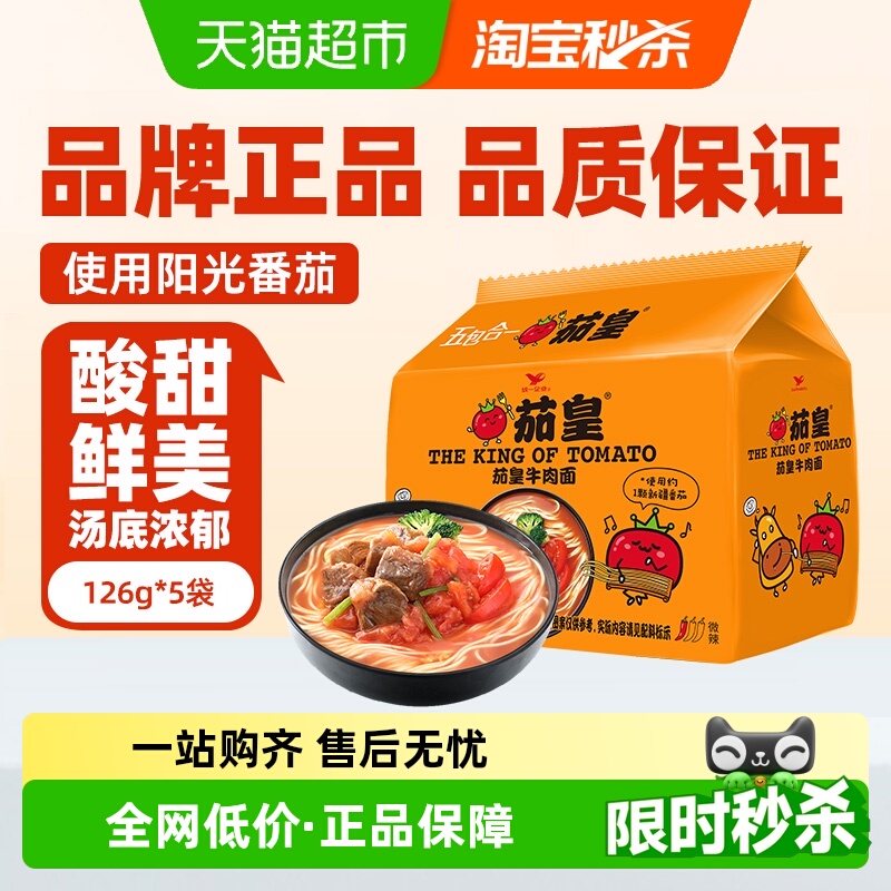 统一 茄皇番茄牛肉面126g*5袋/包方便面网红泡面酸甜鲜美
