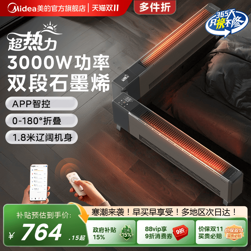 格力石墨烯踢脚线取暖器家用地暖器折叠暖风机节能智能遥控电暖气