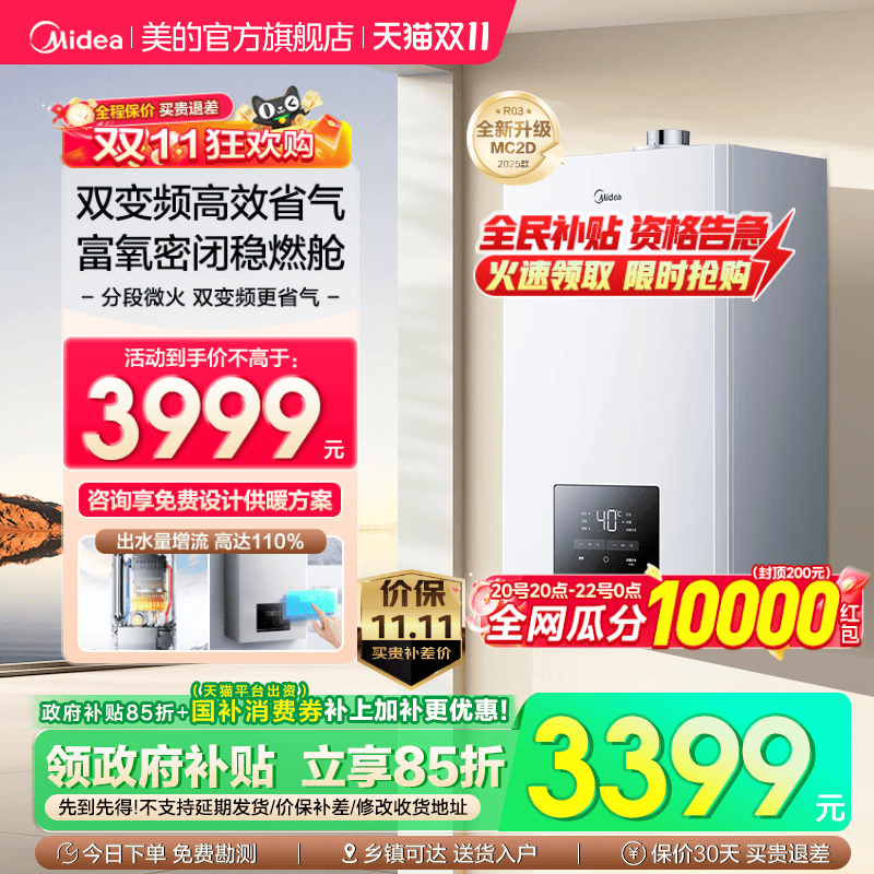 美的壁挂炉天然气双变频家用地暖采暖炉燃气洗浴两用节能新款MC2D
