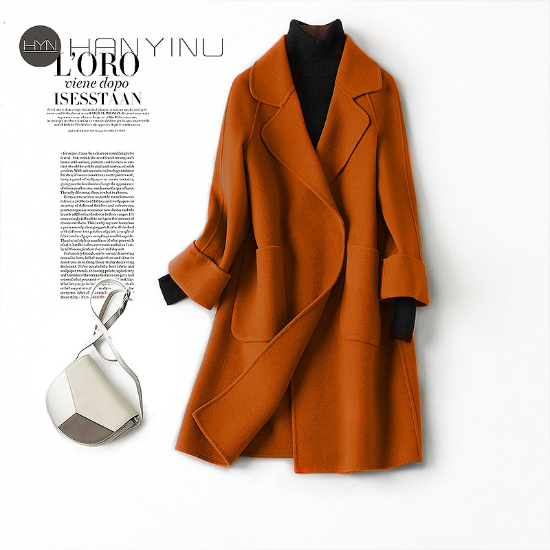 2513-66韩版休闲宽松显瘦大翻领双面羊毛大衣中长款系带毛呢外套