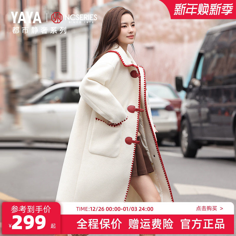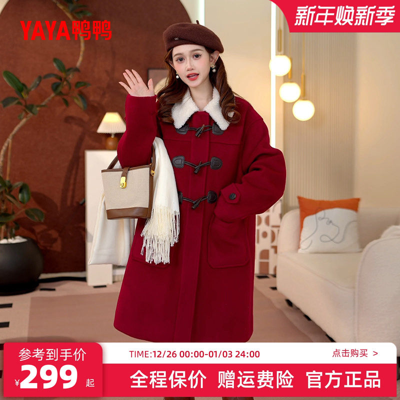 鸭鸭羽绒服女款2025年秋冬新款时尚休闲中长款牛角扣毛呢大衣外套