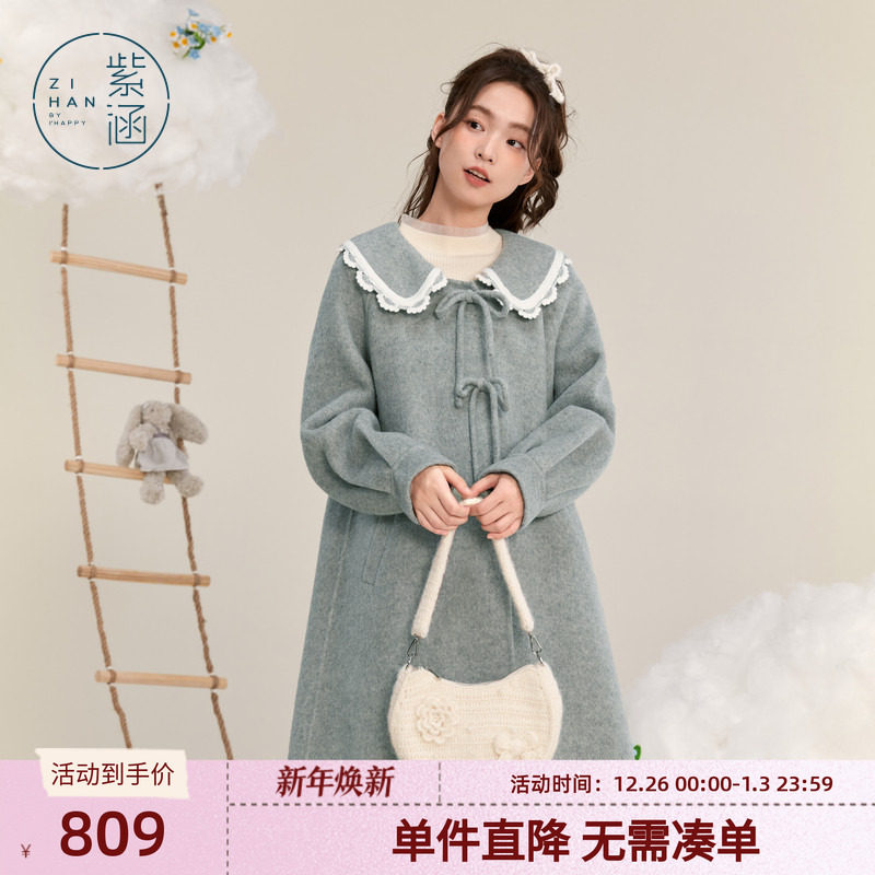 茵曼2025冬季新款中长款绵羊毛双面毛呢外套女士大衣宽松休闲时尚
