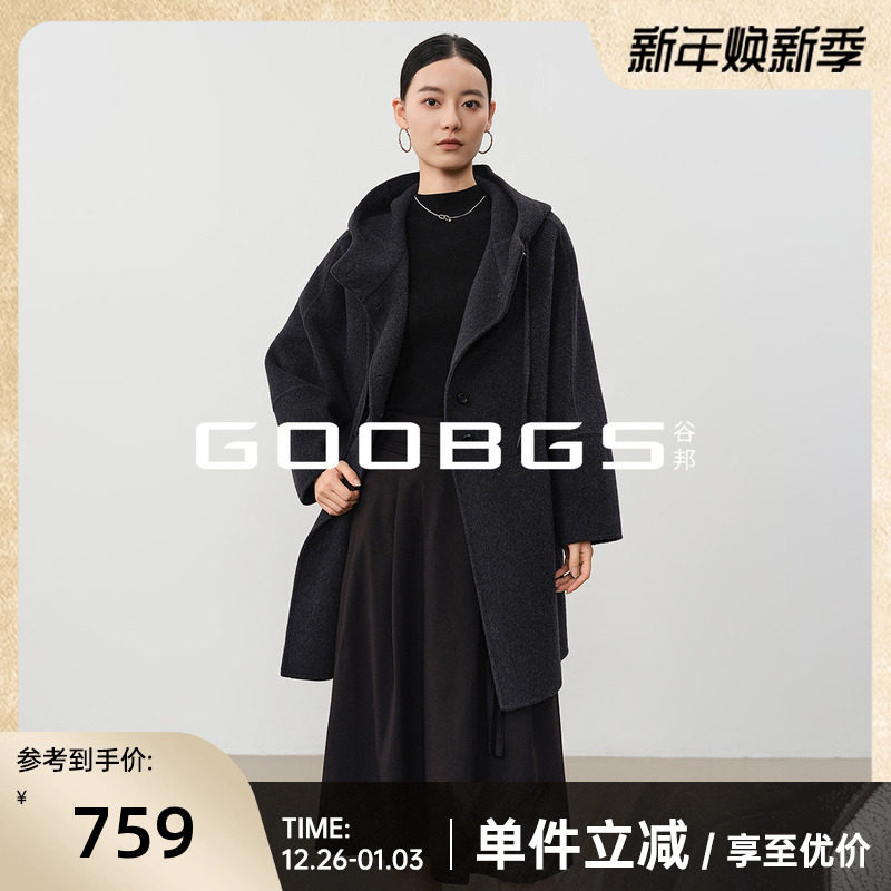 谷邦绵羊毛连帽双面呢大衣女2025冬季新款休闲宽松中长款毛呢外套