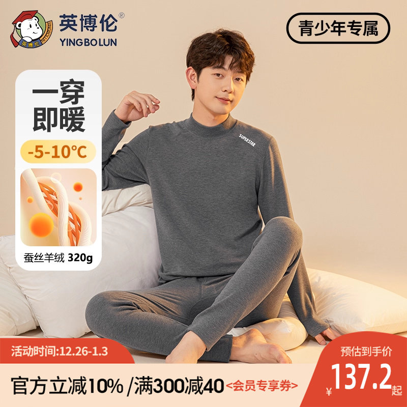 英博伦青少年保暖内衣套装蚕丝羊绒发热男大童秋衣秋裤冬季棉毛衫