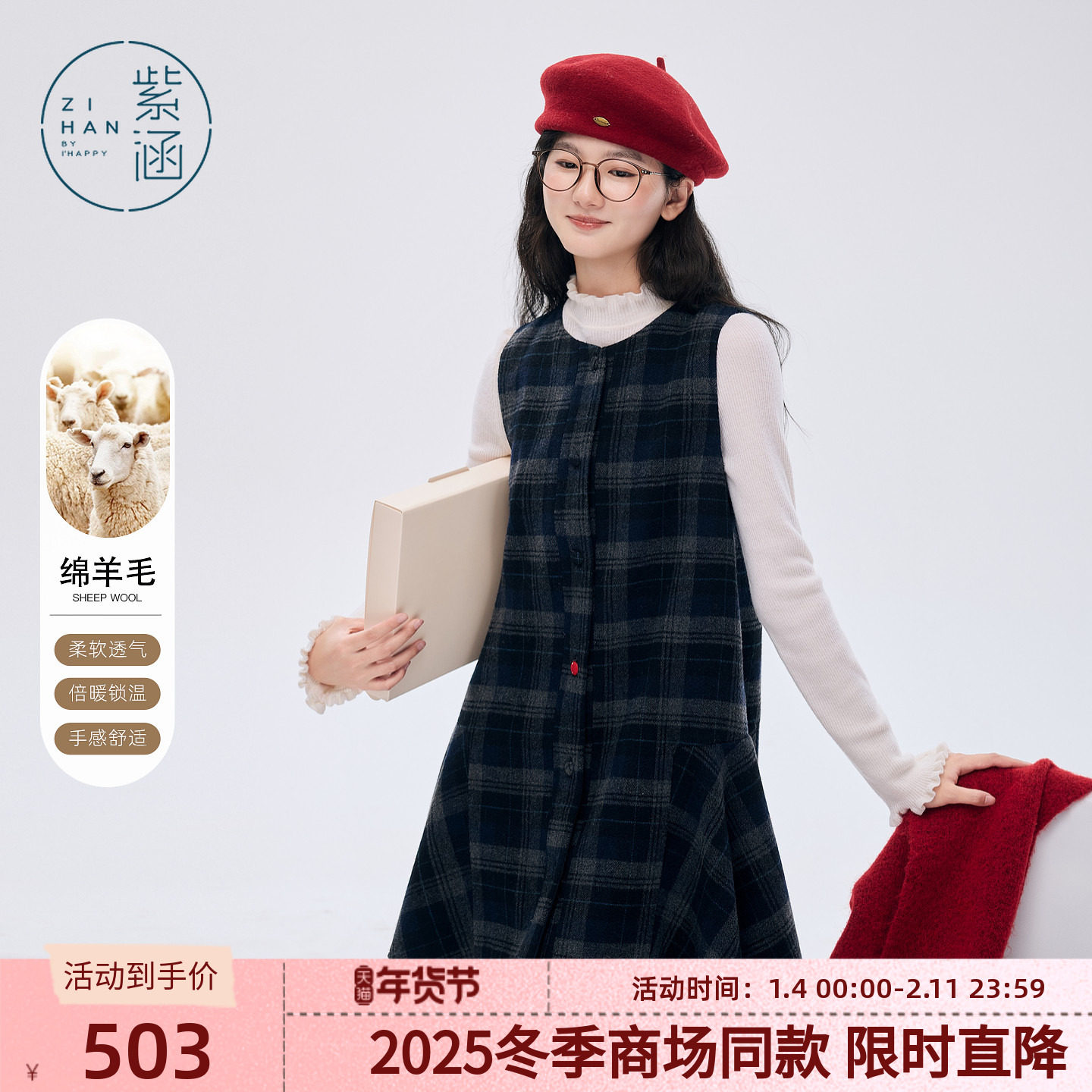 紫涵羊毛格纹无袖背心连衣裙女2025冬季新款宽松内搭圆领a字短裙