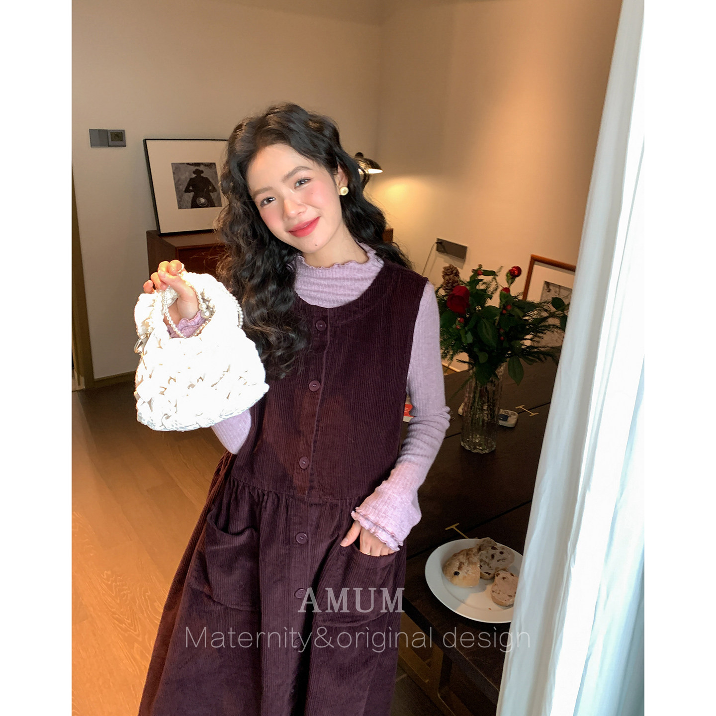 ◆AMUM孕妇装◆复古顶流~灯芯绒紫色a字连衣裙叠穿法式无袖背心裙
