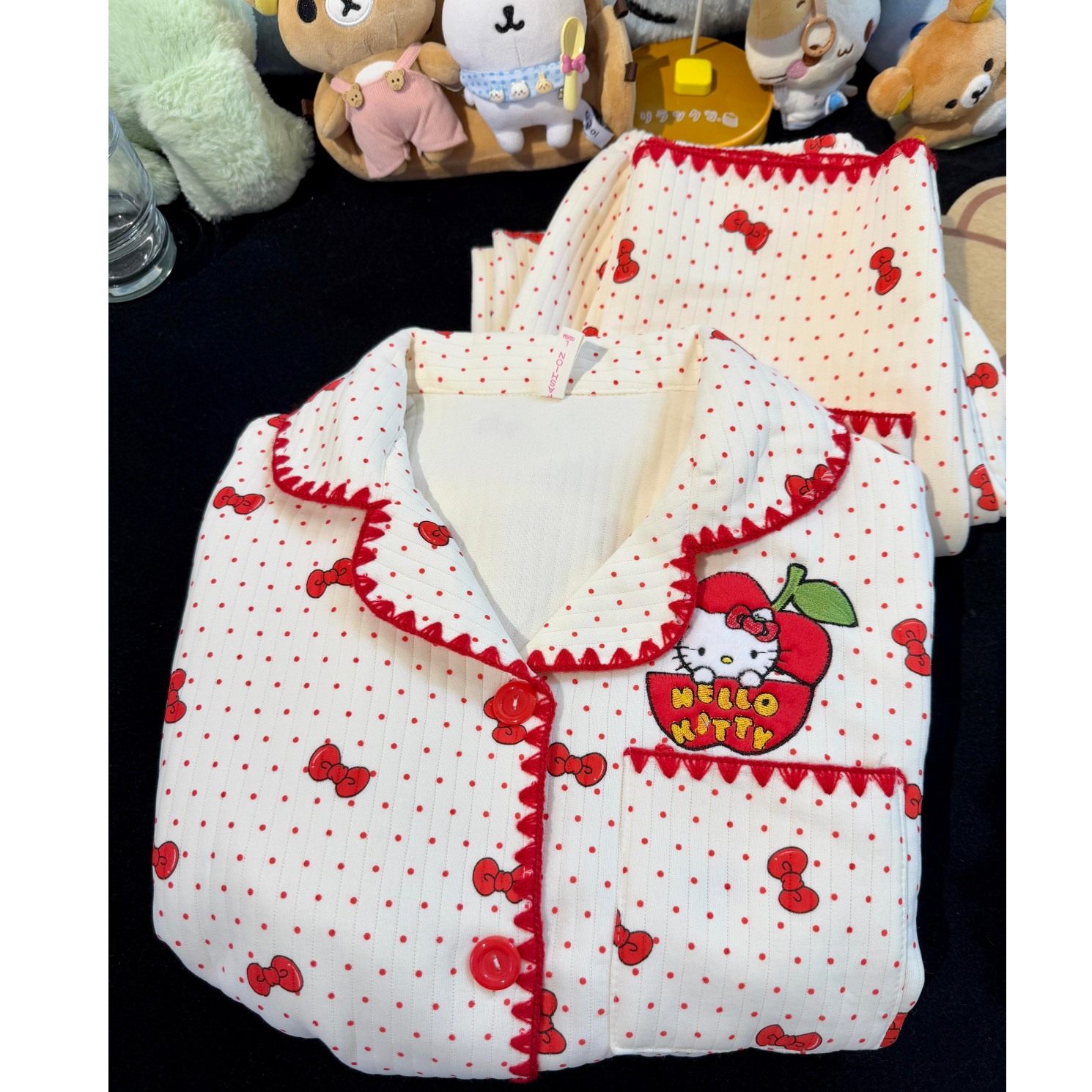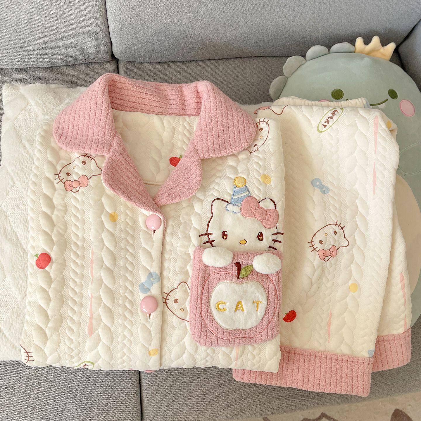 可爱波点网红睡衣女甜美苹果KT猫冬季款空气棉夹层开衫多巴胺套装