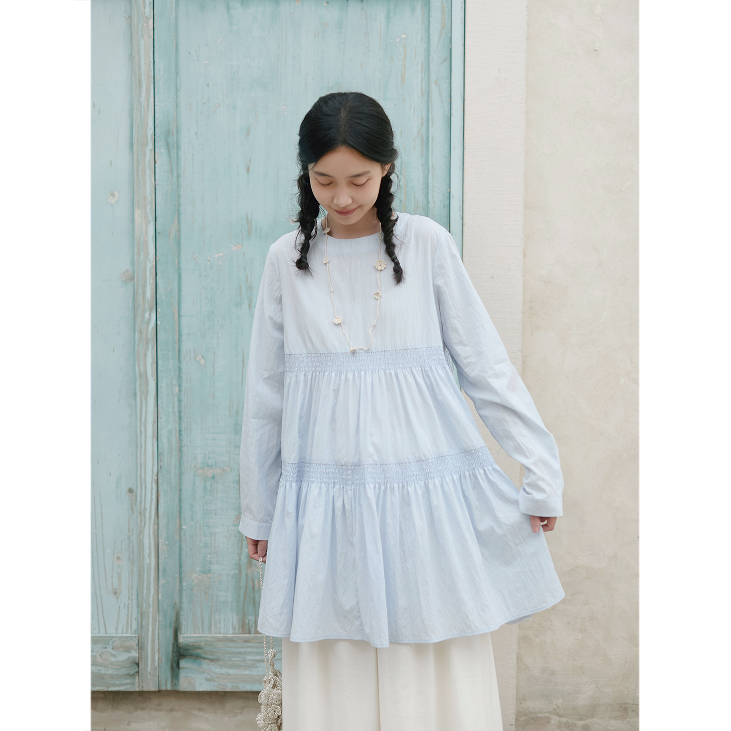 Seams Sense|简约文艺圆领宽松双层打揽中长蛋糕式连衣裙01035
