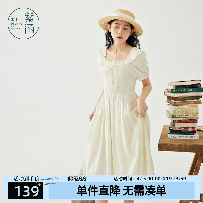 紫涵法式浪漫打揽连衣裙女夏季新款文艺甜美方领收腰短袖中长裙子