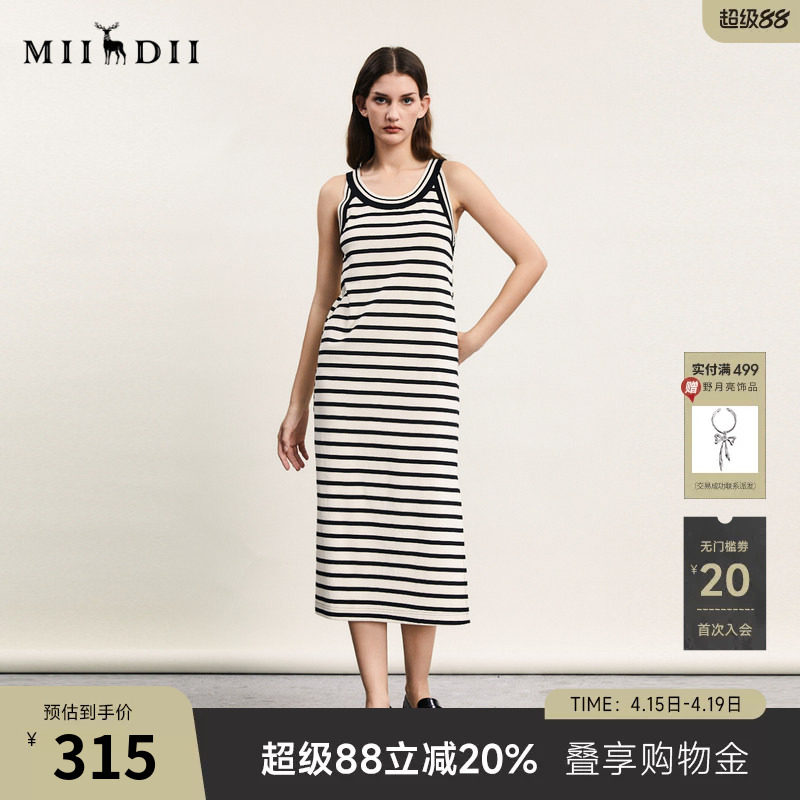 谜底连衣裙无袖女春新款文艺风条纹亲肤修身中长裙241ML0117