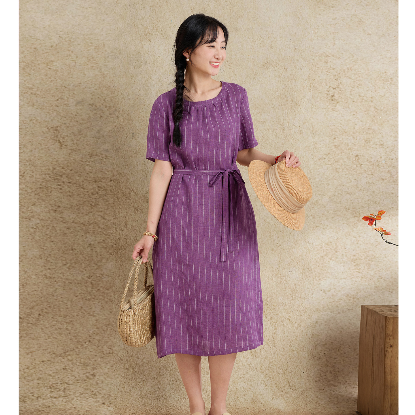 梭家|你的笑颜·玖|文艺复古收腰细格色织亚麻连衣裙透气中长裙
