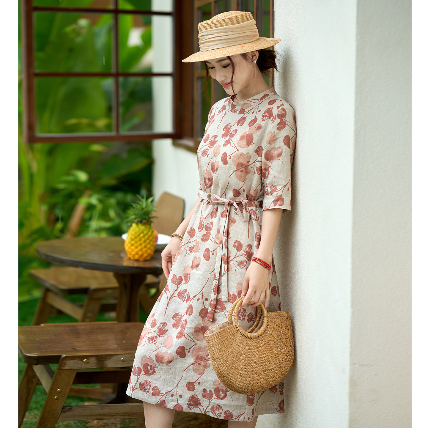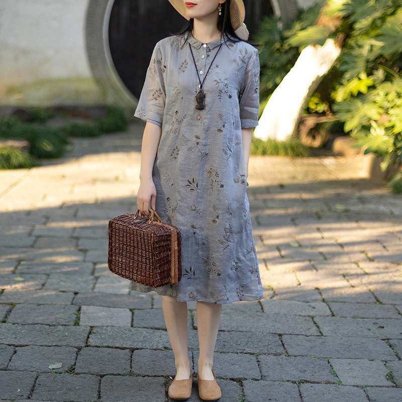 田园午后/十木米原创百分百亚麻雨露麻印花文艺清新中长款连衣裙