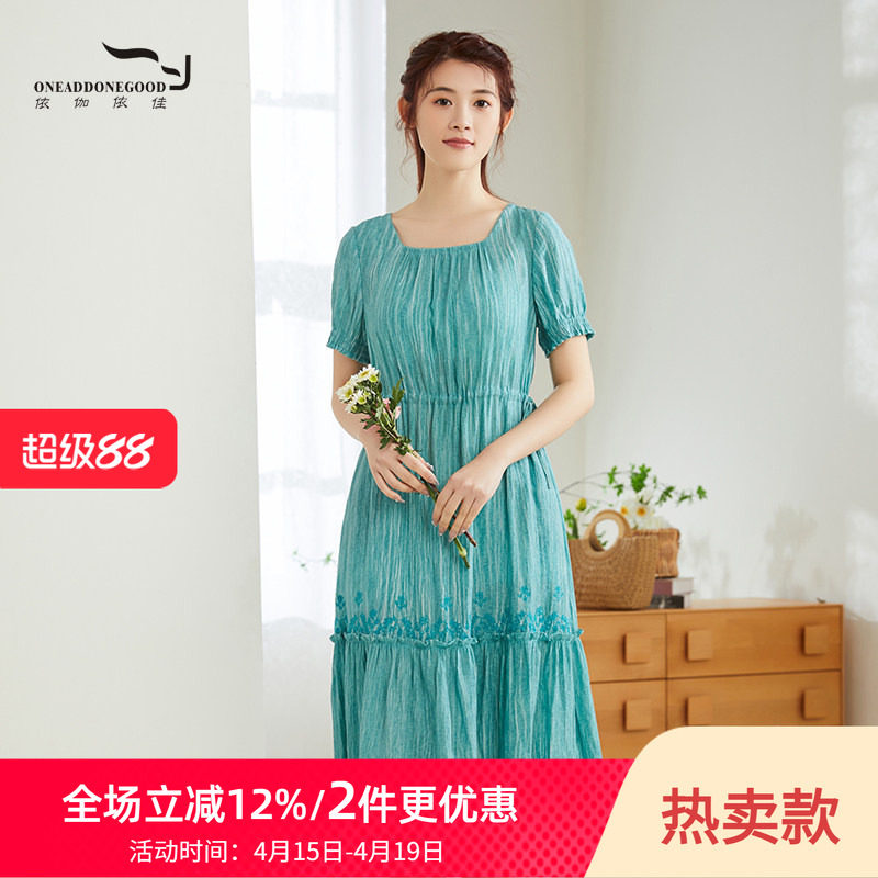 布景连衣裙女夏季新品简约文艺刺绣系带收腰设计中长短袖裙子0430