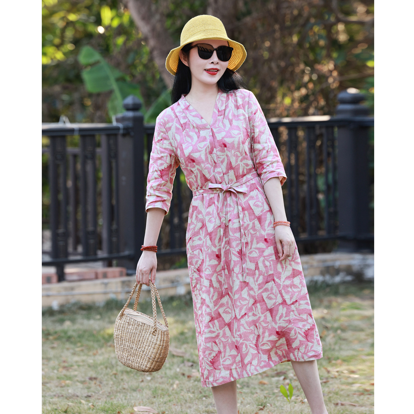 子曰原创设计文艺休闲苎麻印花中长款连衣裙 宽松轻薄复古V领袍子