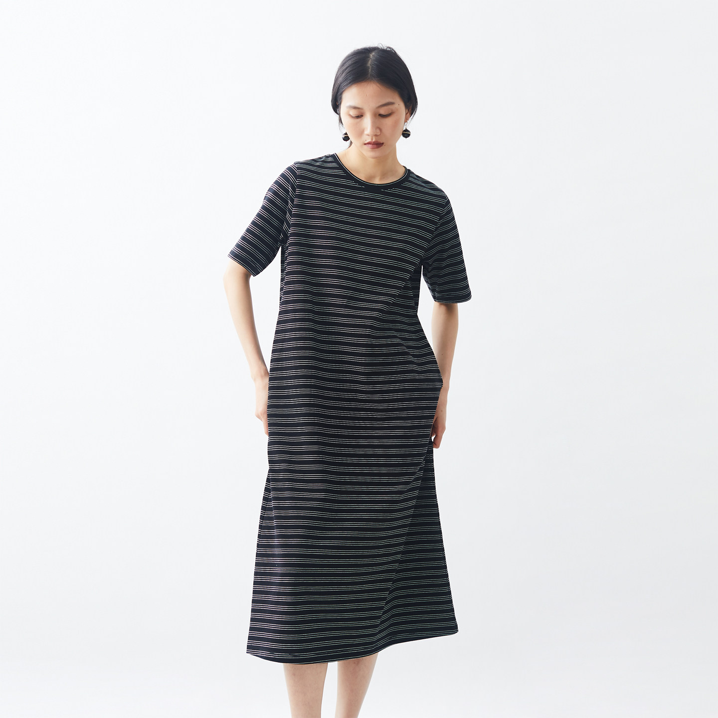 春夏新品 文艺棉针织条纹宽松短袖T裙 小鱼气质中长款t恤连衣裙