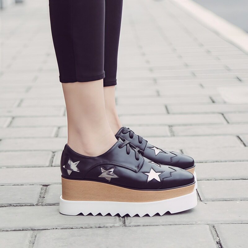 明星同款2026春秋新款星星松糕厚底韩版系带方头坡跟单鞋女英伦风