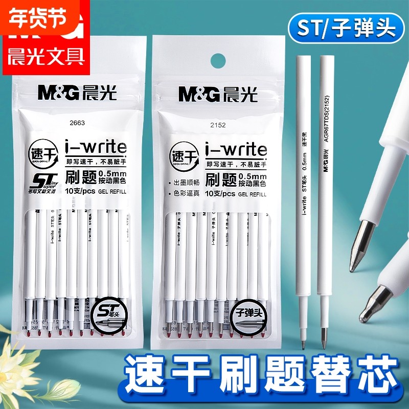 晨光按动笔芯0.5mmST速干顺滑红蓝黑色子弹头按动式G-5小学初高中生专用考试GP1008圆珠中性水笔芯替换芯尖叫