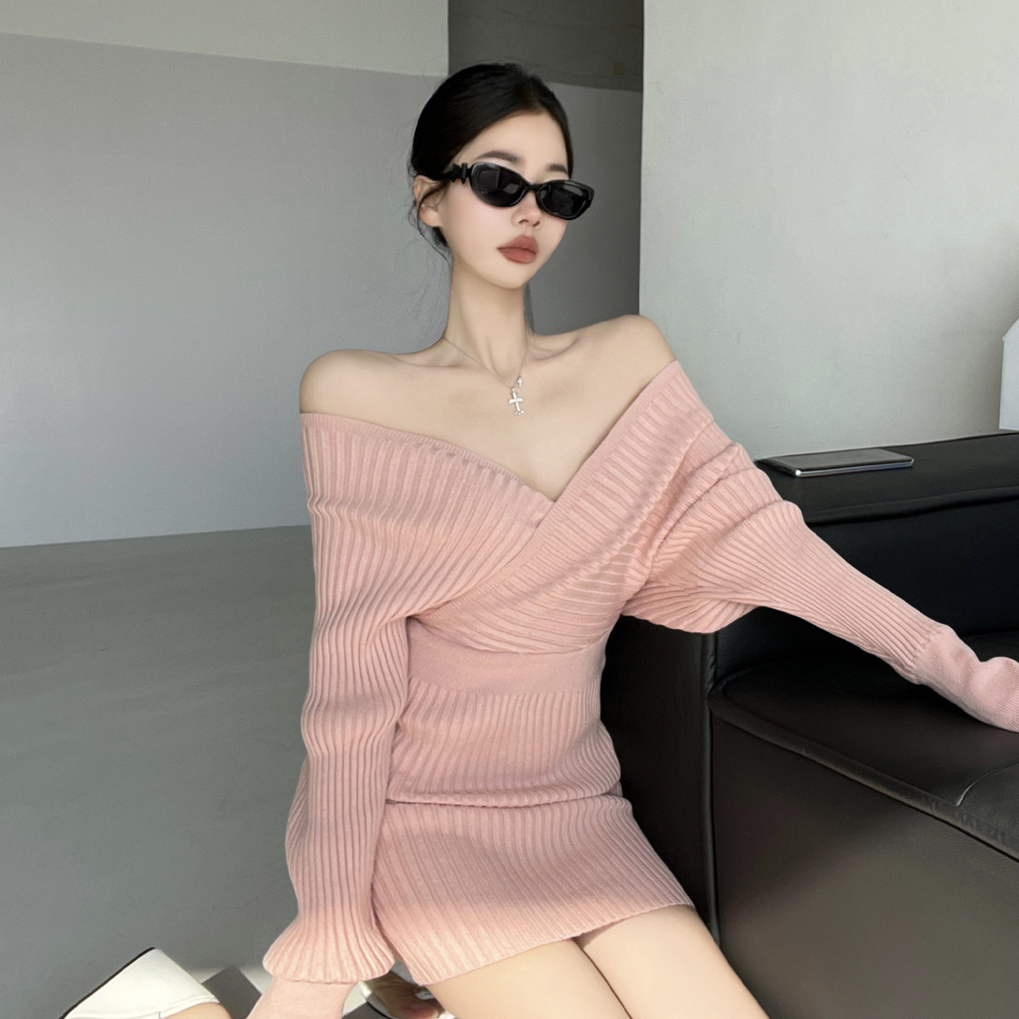 南韩千金~温柔纯欲风一字领针织连衣裙性感包臀名媛气质辣妹短裙
