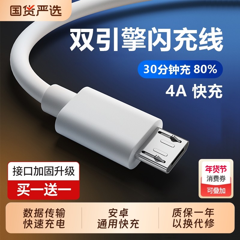4A老式安卓接口数据线适用华为vivo小米oppo快充老款手机micro小风扇USB充电线充电宝台灯耳机type-c充电线