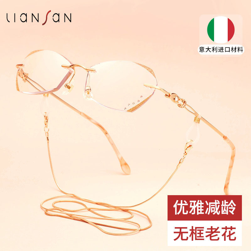 进口老花眼镜女士品牌高档正品防蓝光高清无框洋气花镜女款带链子