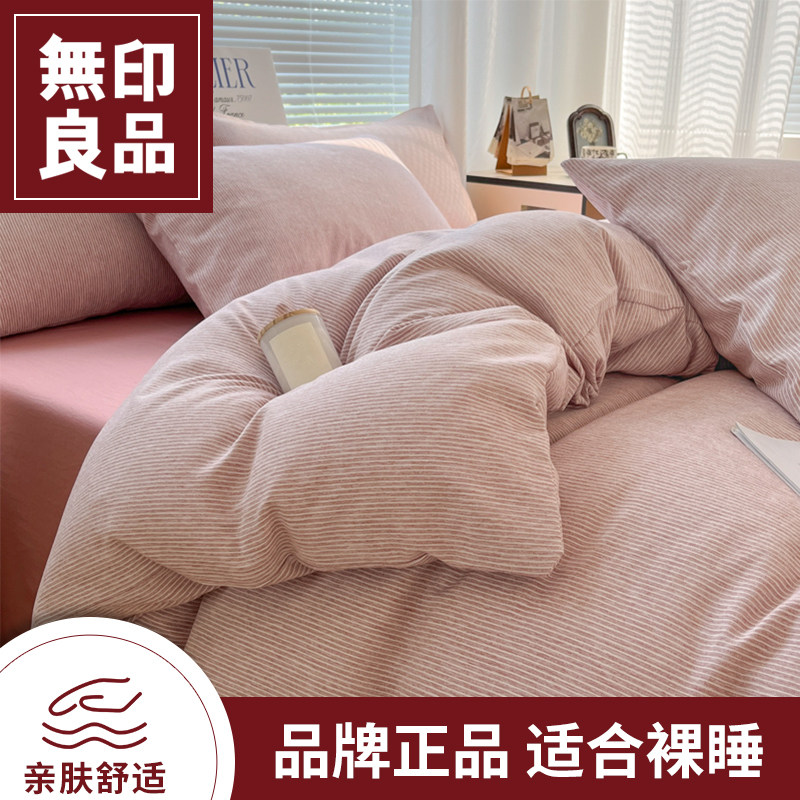 无印良品四件套全棉纯棉天竺棉针织条纹被套纯色床单裸睡床上用品